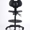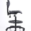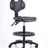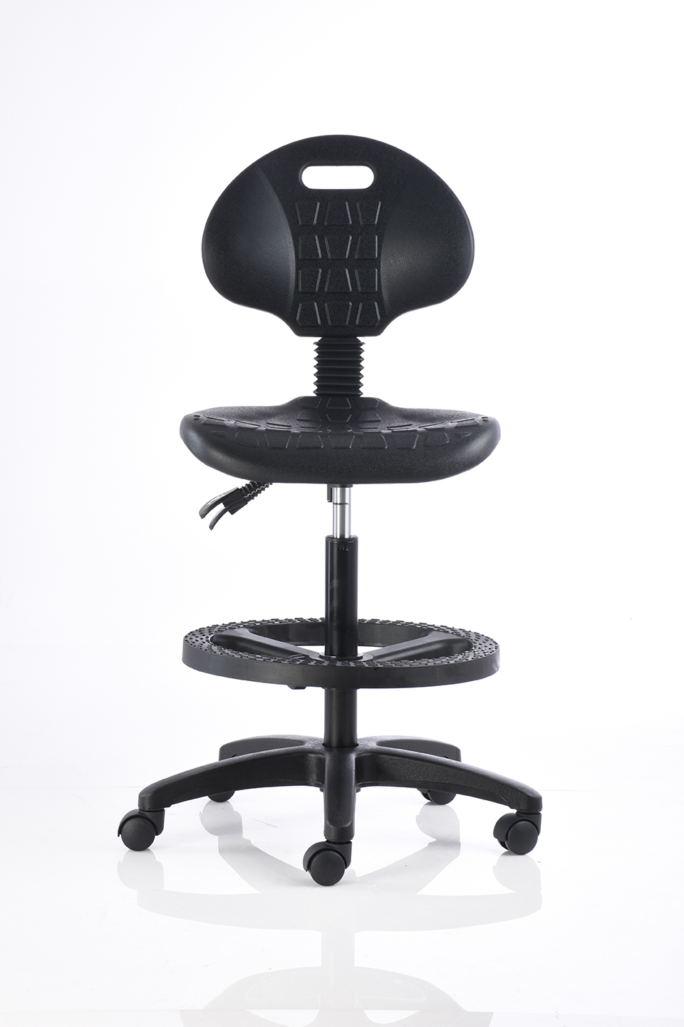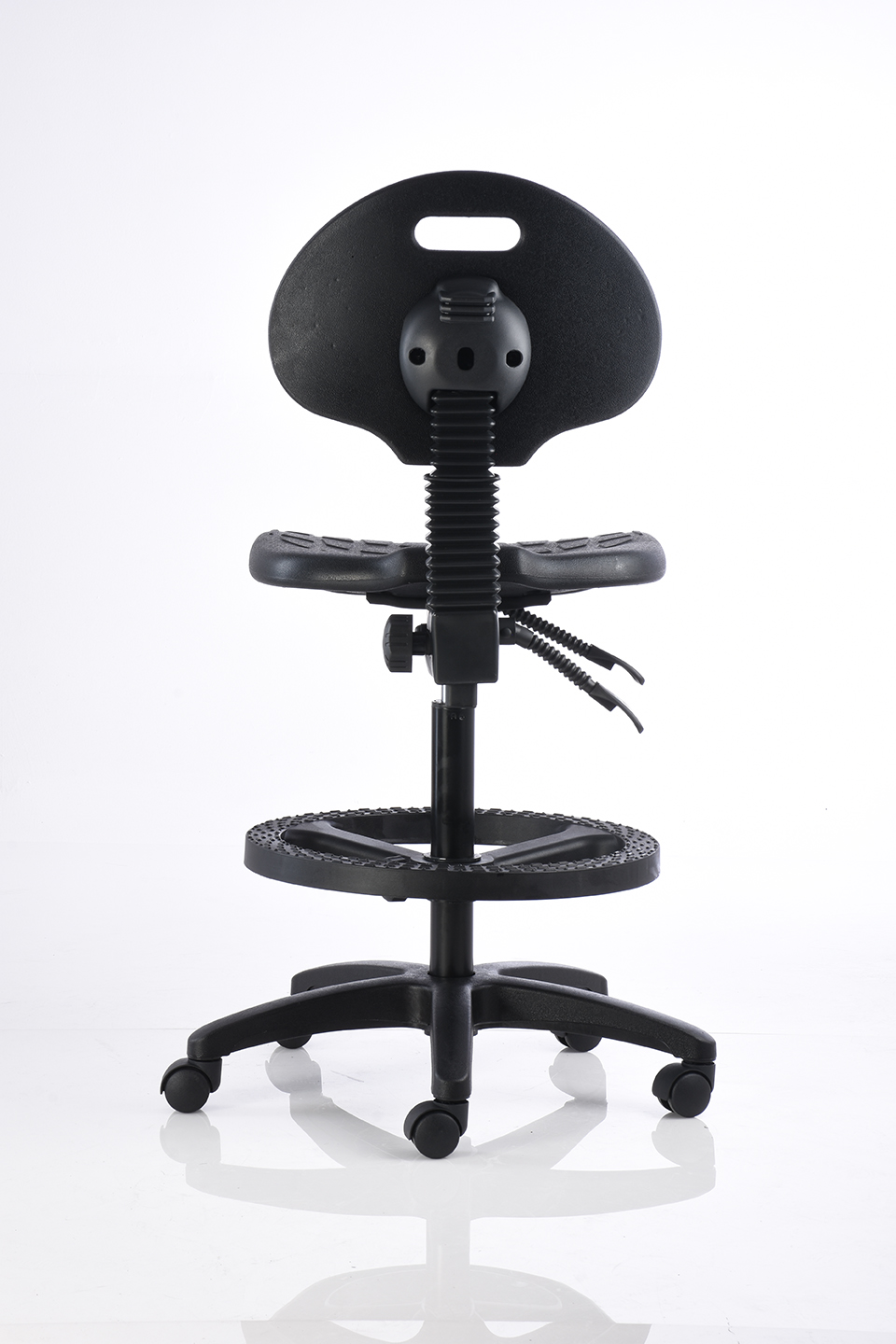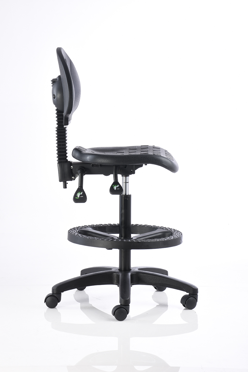Banco alto de trabajo fabricado en poliuretano inyectado color negro, con mecanismo de dos palancas, aro de nylon y pistón de cajero.