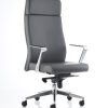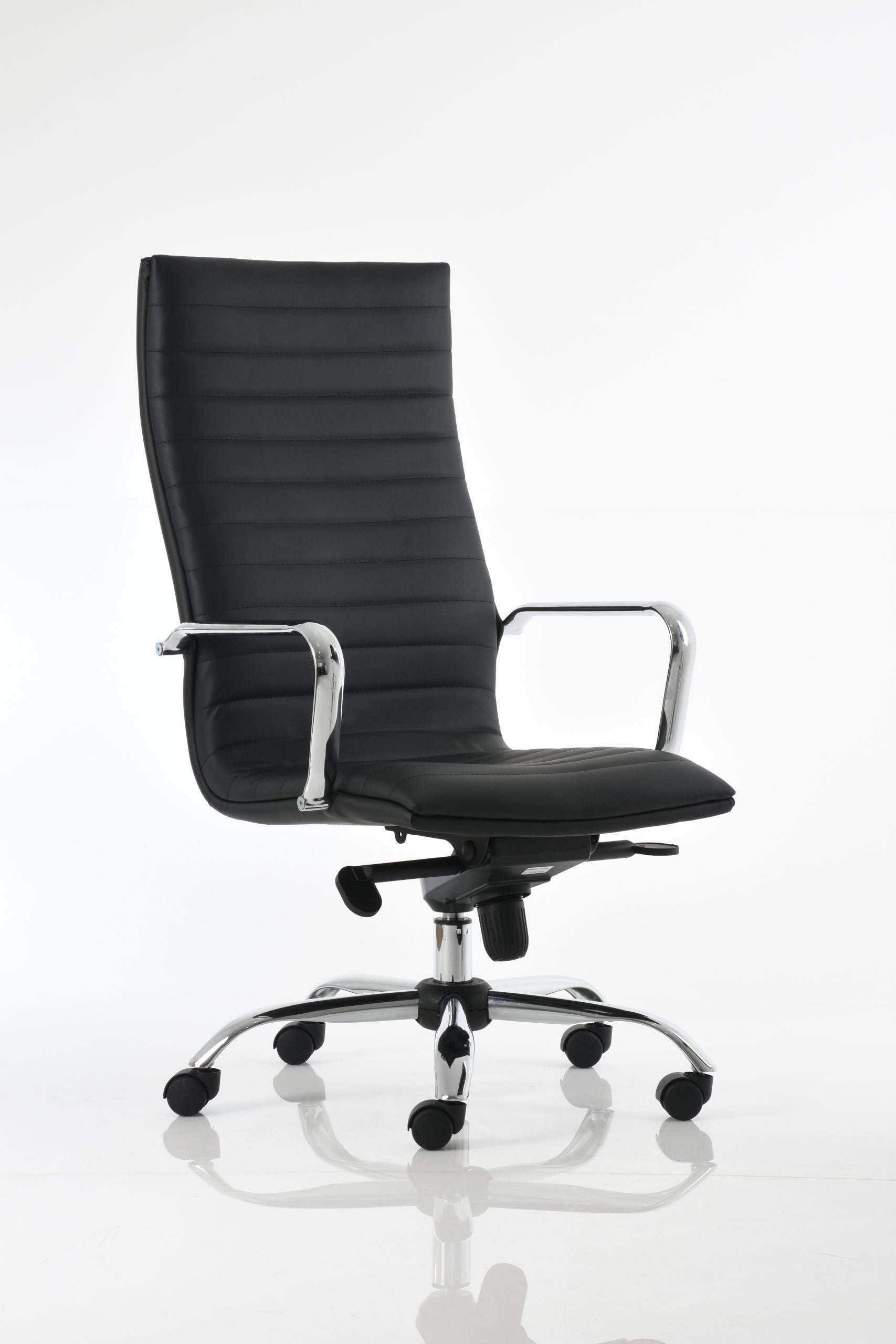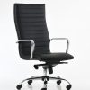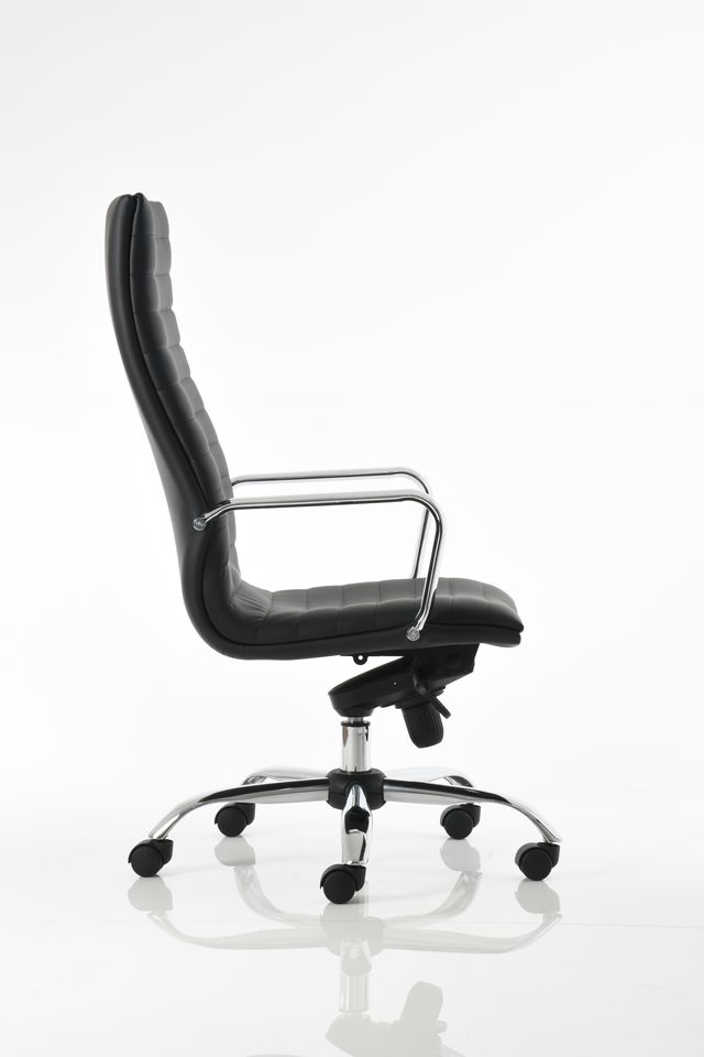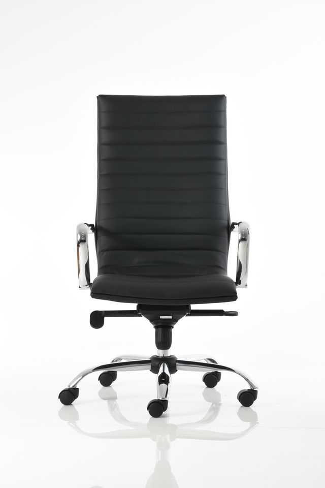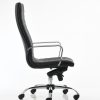 Sillón para dirección extra alto con cabecera, brazos de aluminio, base de aluminio con ruedas de 60 mm, mecanismo de rodilla Syncro con cinco posiciones de bloqueo y tapizado en imitación de piel New Leather color negro.