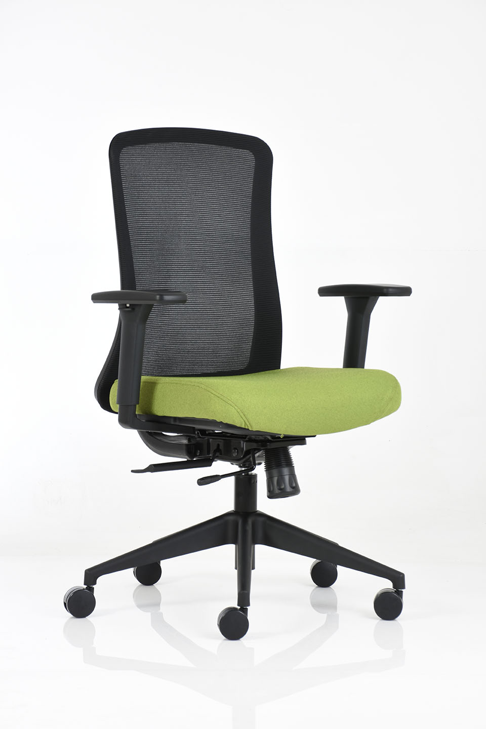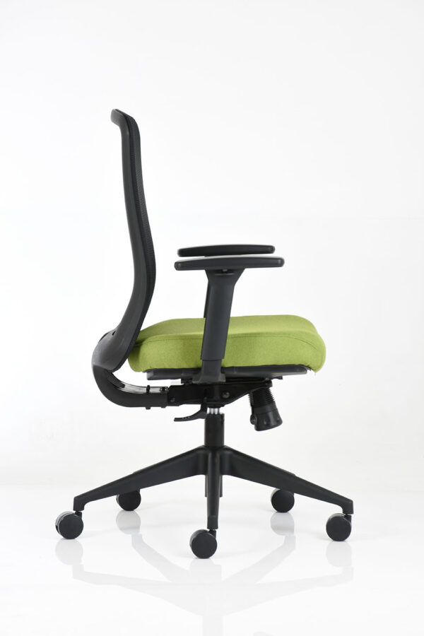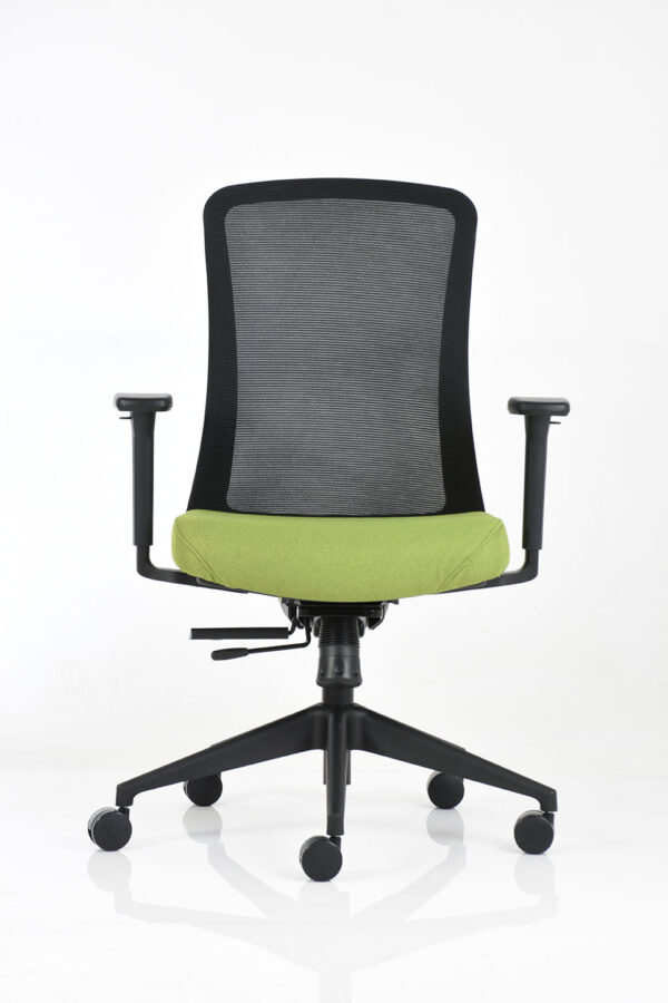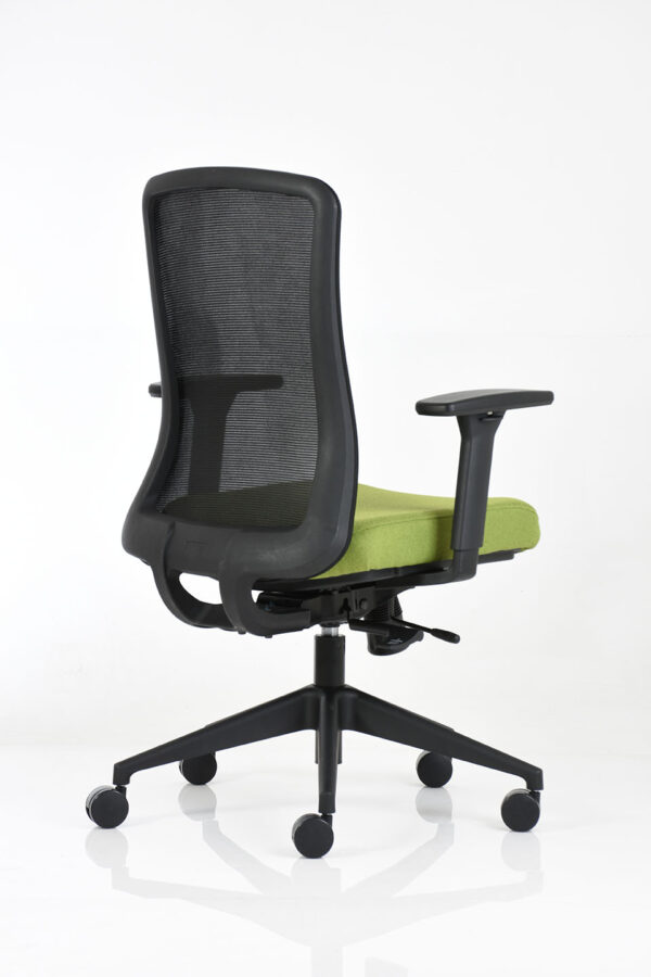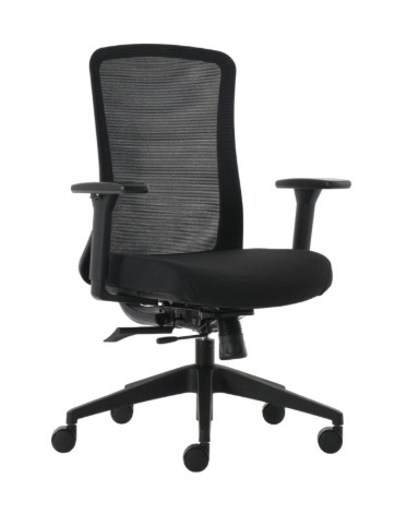 Sillón operativo de respaldo medio, con estructura fabricada en color negro, brazos 3D con ajuste de altura, profundidad y giro, base de 5 puntas con ruedas de 60 mm en color negro, respaldo tapizado en malla soft color negro y asiento tapizado en tela. Incluye mecanismo ejecutivo Syncro de dos palancas con deslizador (ajuste de profundidad del asiento en cuatro posiciones de bloqueo) y sistema antishock.