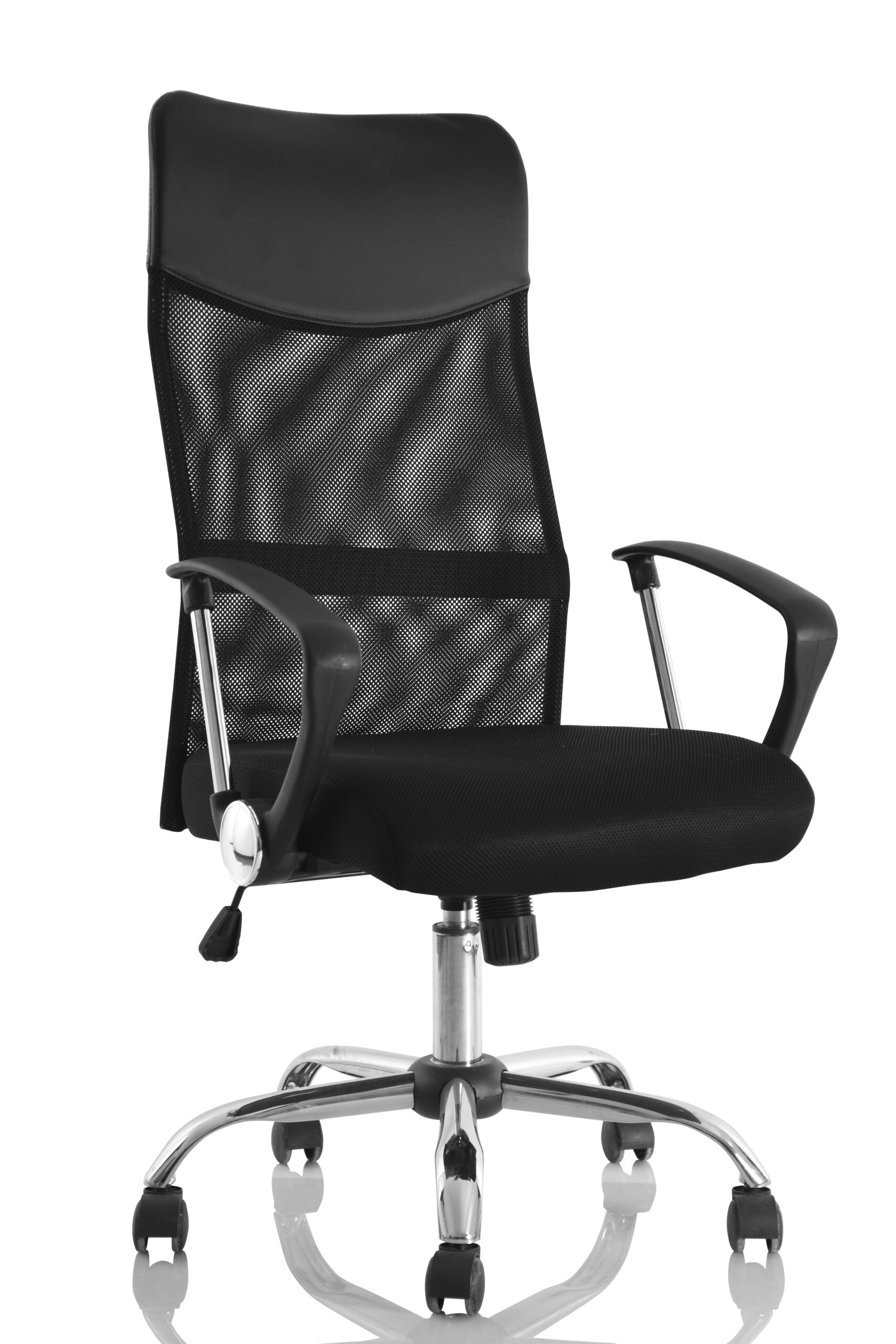 Sillón ejecutivo de respaldo alto, tapizado con malla en el respaldo y tela tecno en el asiento color negro, con brazos fijos con aplicaciones en cromo, mecanismo ejecutivo reclinable y base cromada, diseñado para uso ligero.