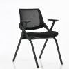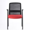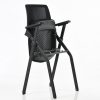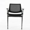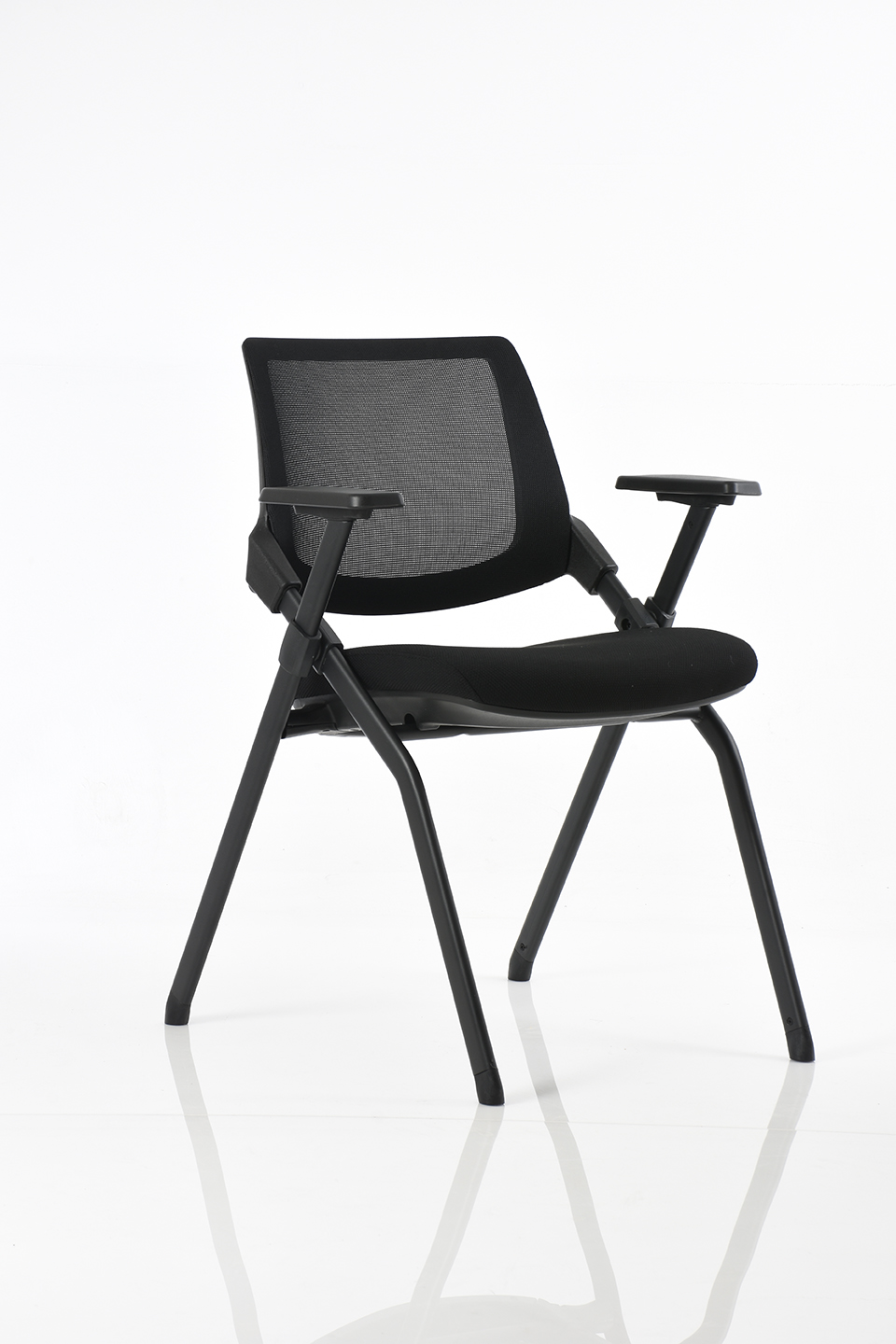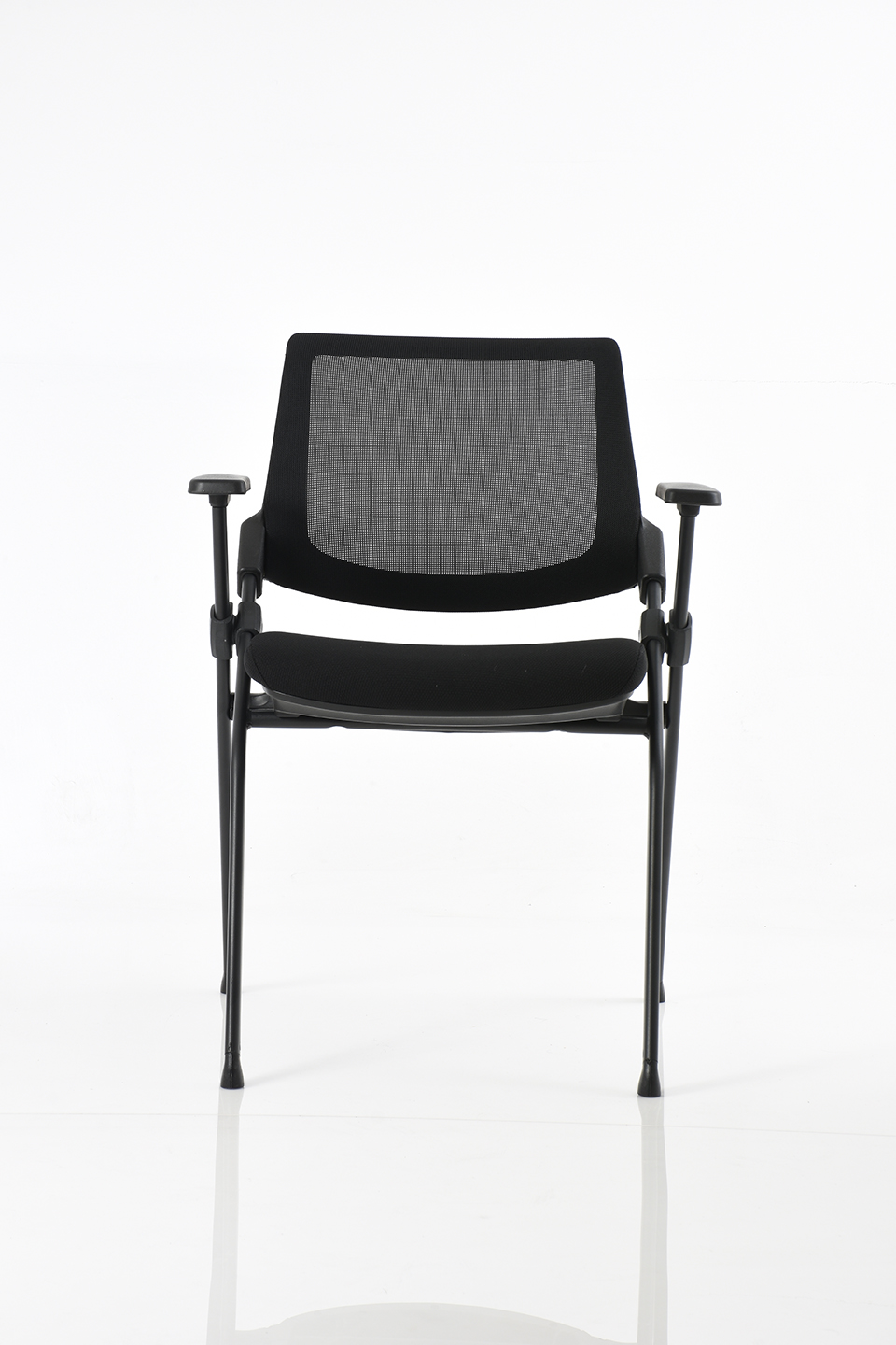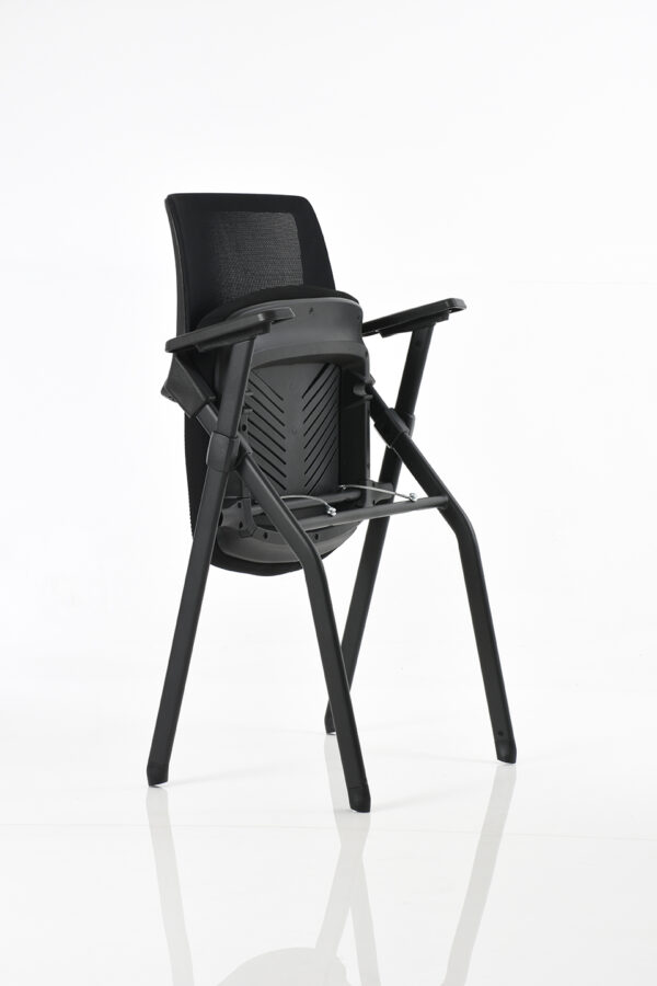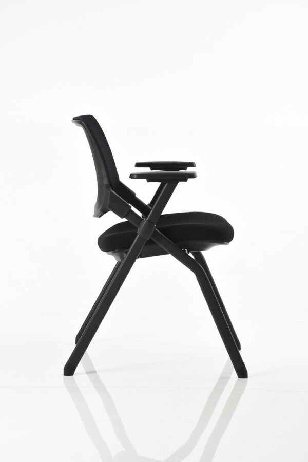 Esta silla para visitante está fabricada con una estructura de tubo rectangular en acabado de pintura gris, la cual integra brazos de polipropileno negro, un respaldo de malla transpirable y un asiento amplio tapizado en tela que incluye una tapa protectora inferior también tapizada en color negro.